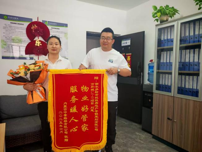 6月9日,市城投房地产公司万和城L6-01生活服务中心收获了一份意义非凡的荣誉——业主亲手赠予的锦旗。锦旗上“物业好管家,服务暖人心”的大字熠熠生辉,饱含业主对万和城L6-01地块生活服务中心物业服务的高度认可。