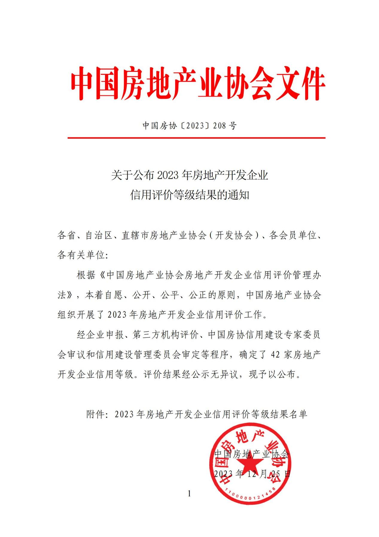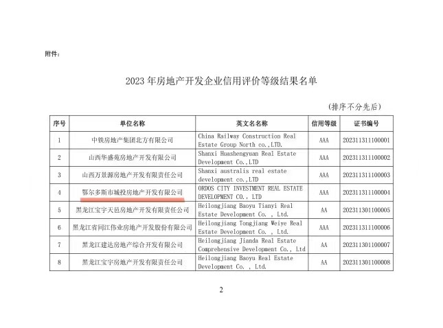 2023年年末,中国房地产协会公布了2023年房地产开发企业信用评价等级结果,市城投房地产公司赢得国家级“房地产开发企业信用评价企业”殊荣,AAA级为此次信用评价的最高等级。